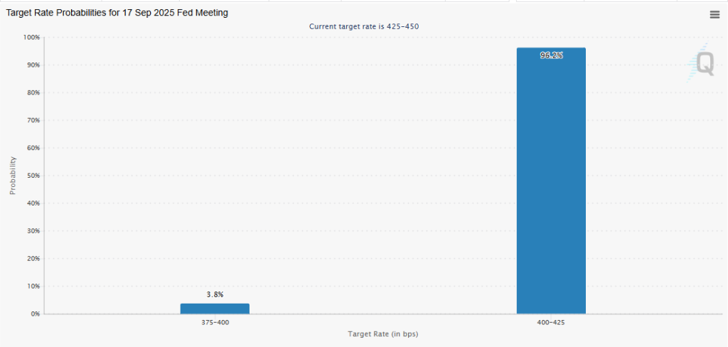 De acordo com dados do CME FedWatch Tool, há 94,2% de probabilidade de que o Fed reduza a taxa em 25 bps na reunião desta semana.