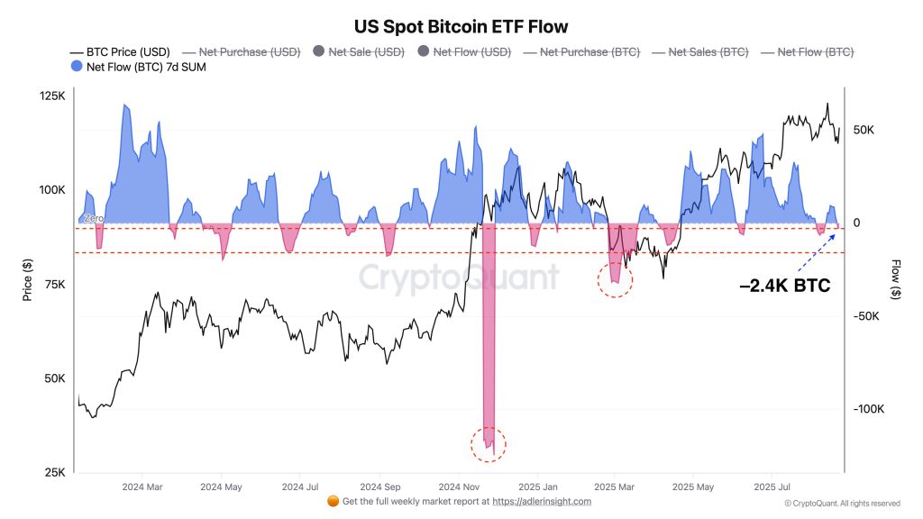 No campo dos ETFs de Bitcoin nos Estados Unidos, os últimos sete dias mostraram saída líquida de 2,4 mil BTC, equivalentes a cerca de US$ 285 milhões.