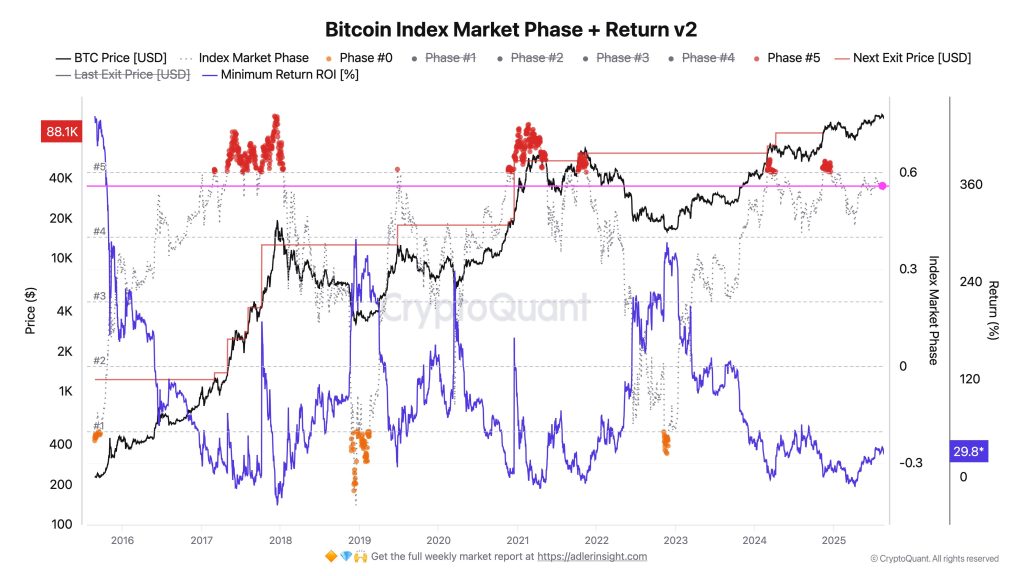 Adler Jr também analisa o indicador ‘Index Market Phase’, que coloca o Bitcoin no estágio #4, prestes a migrar para o estágio #5, fase típica de ‘touro tardio’.