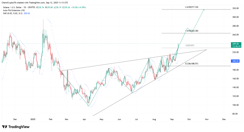 A análise técnica mostra que o Solana rompeu a resistência de US$ 229 ao sair de um triângulo ascendente que vinha se estreitando desde o início de agosto.
