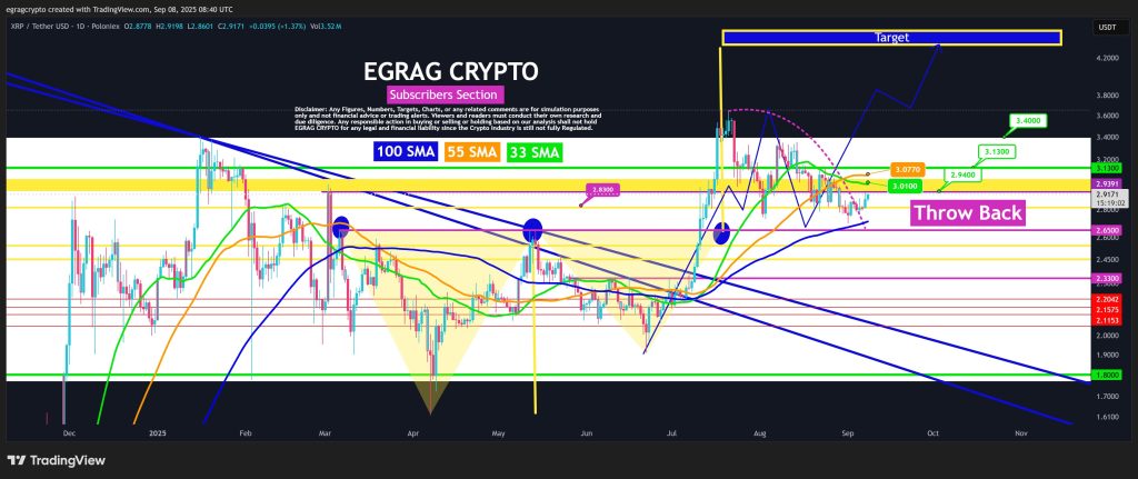 Para o estrategista EGRAG Crypto, a marca de US$ 2,94 já foi superada, mas a barreira mais importante está na média móvel simples de 33 dias, atualmente em US$ 2,98.