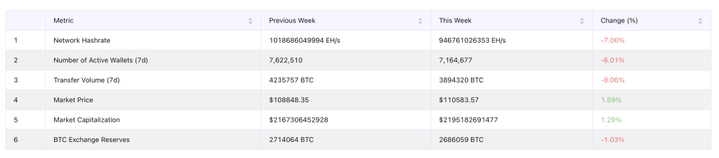 O número de carteiras ativas caiu 6% na semana, a taxa de hash recuou mais de 7% e o volume de transações diminuiu cerca de 8%.