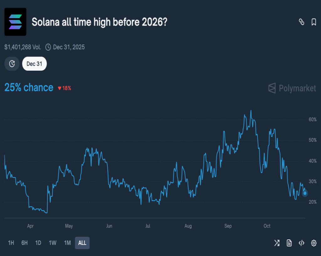 O Polymarket dá apenas 25% de chance (queda de 2% em relação a 29/10) de Solana alcançar um novo recorde histórico antes de 2026. Isso considerando o SOL sendo negociado a US$ 196, alta de quase 1% em 24 horas.