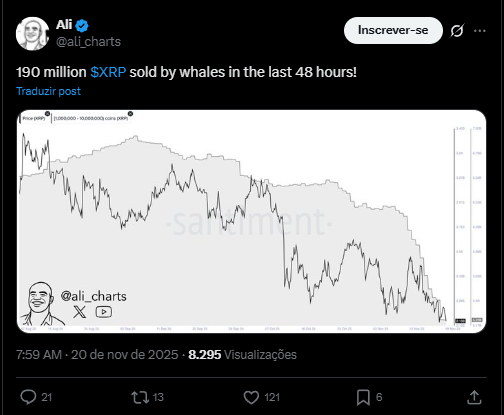 Nas últimas 48 horas, baleias despejaram 190 milhões de XRP, segundo dados do analista Ali.