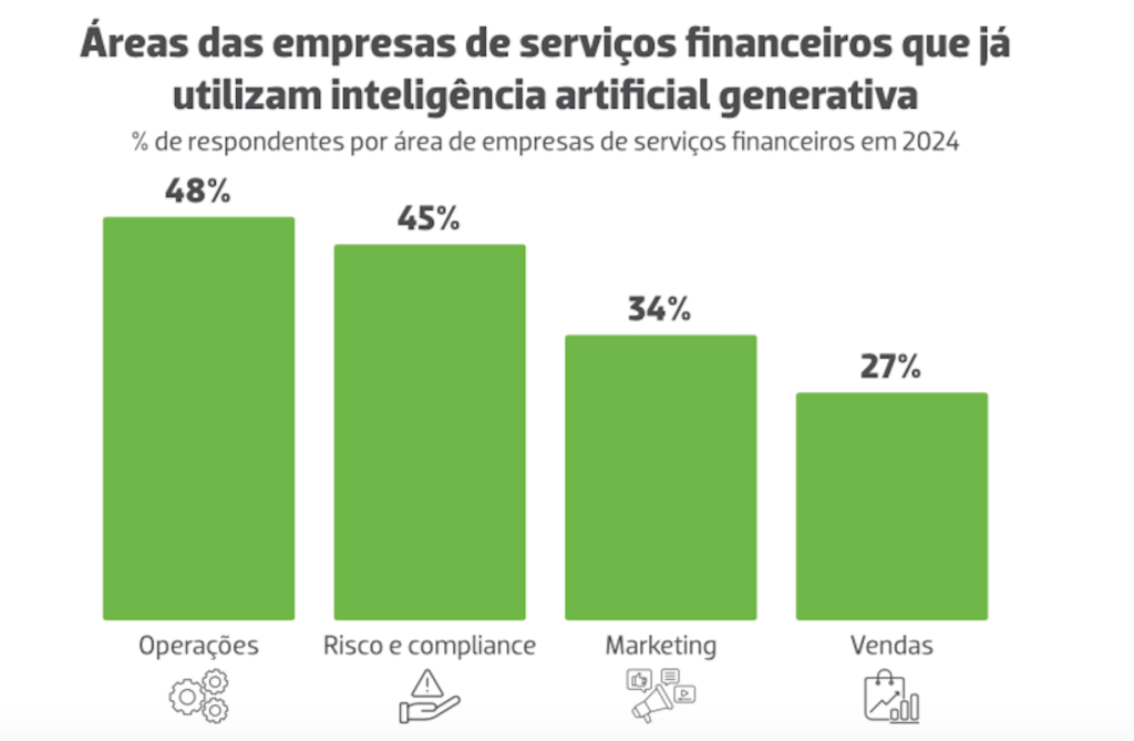 Por fim, a Anbima mostra, no estudo, as áreas e atividades em que empresas de serviços financeiros mais estão usando IA, neste ano de 2024.