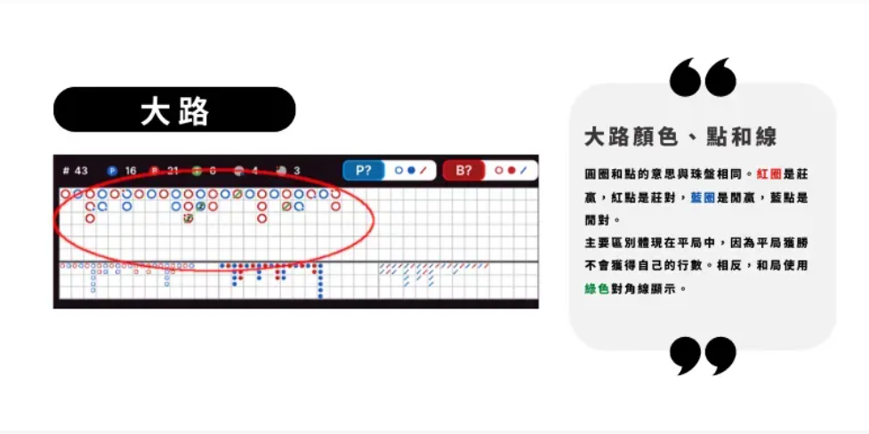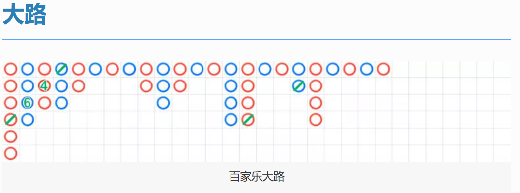 大路以圆圈记录结果,红圈表示庄赢,蓝圈表示闲赢。若连续出现相同结果则向下排列,不同结果则向右换列。当出现和局时,在上一局的结果上画绿色斜线。若连续出现多次和局,则以绿色数字标注。