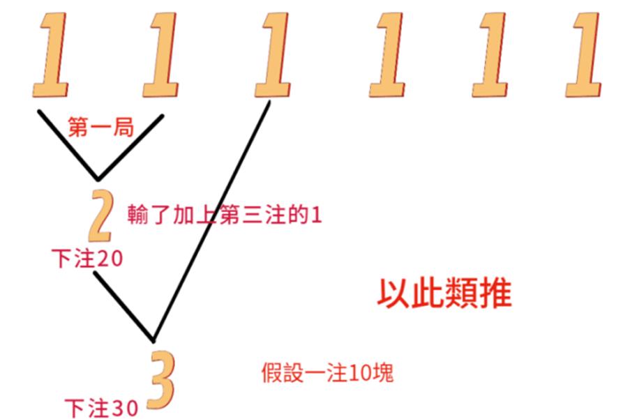 此策略适用于「连赢时期」。玩家先设定本金上限,并写下一串数字,如:111222333。