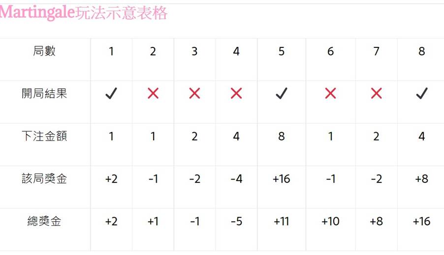 - 下8注,再赢 → 下16注。