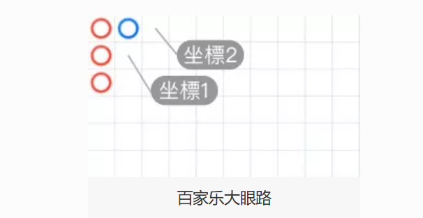 大眼路从大路第二列第二行开始记录,用以分析走势是否有规律。红色表示规律强,蓝色代表随机。蟑螂路(甲由路)则从第四列第二行开始,与大眼路原理相同,只是起点不同,用来辅助判断趋势变化。