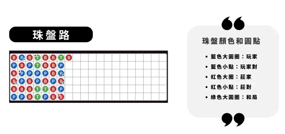 珠盘路是最基础的记录方式,每一局的结果以珠子形式显示。红色代表庄家(B),蓝色代表闲家(P),绿色代表和局(T)。