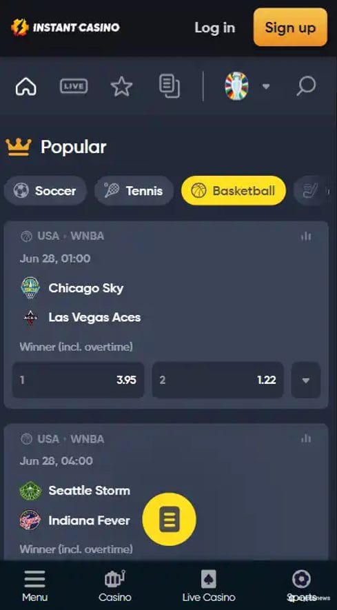 巨型骰子提供我们名单中最优秀的加密体育博彩之一。你可以投注超过 40 种热门及小众运动,从足球和网球到篮球和冰球皆有涵盖。赛中投注选项丰富,具备动态赔率、即时统计数据及实时投注机会,让你能迅速赢取奖金。