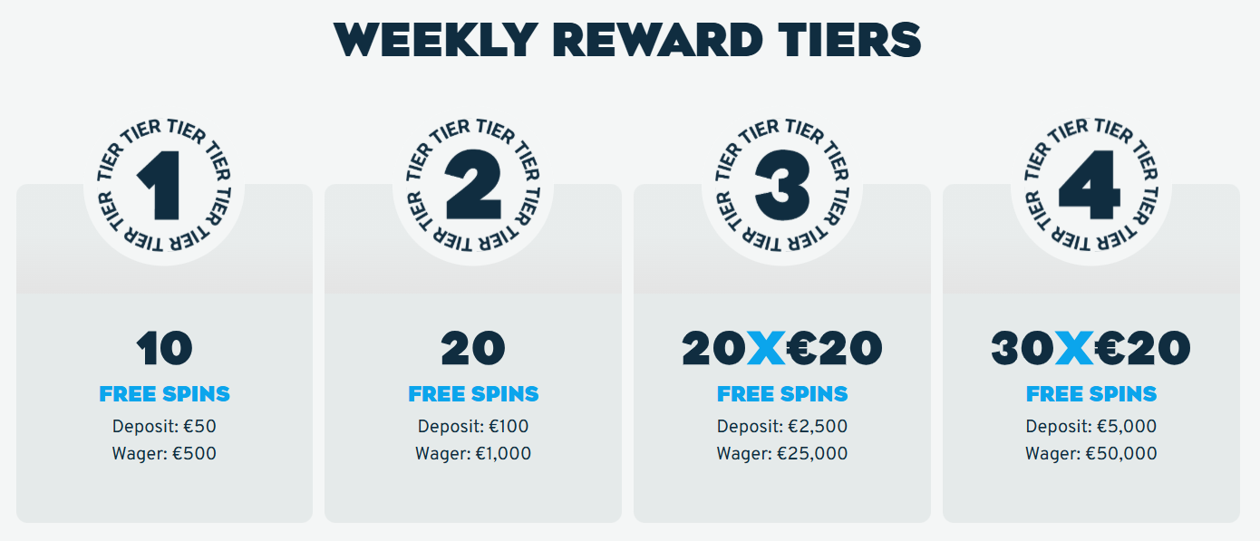 对于已有玩家而言,Cryptorino是获得每周免费旋转的绝佳选择。根据你在周一至周四的投注活动,你可以解锁 30 次免费旋转,每次价值诱人的 20 欧元!不过请注意需要进行大量投注才能释放这些超大旋转。