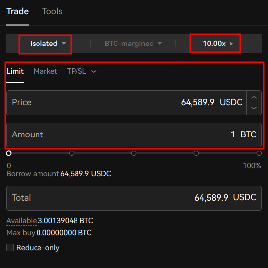 大多数加密货币杠杆交易平台在高级交易中使用类似的交易界面。选择使用隔离保证金还是全仓保证金。然后,选择您的杠杆倍数和交易金额。您还可以选择限价单或市价单。限价单通常手续费较低,但可能不会立即执行(甚至可能完全不执行)。