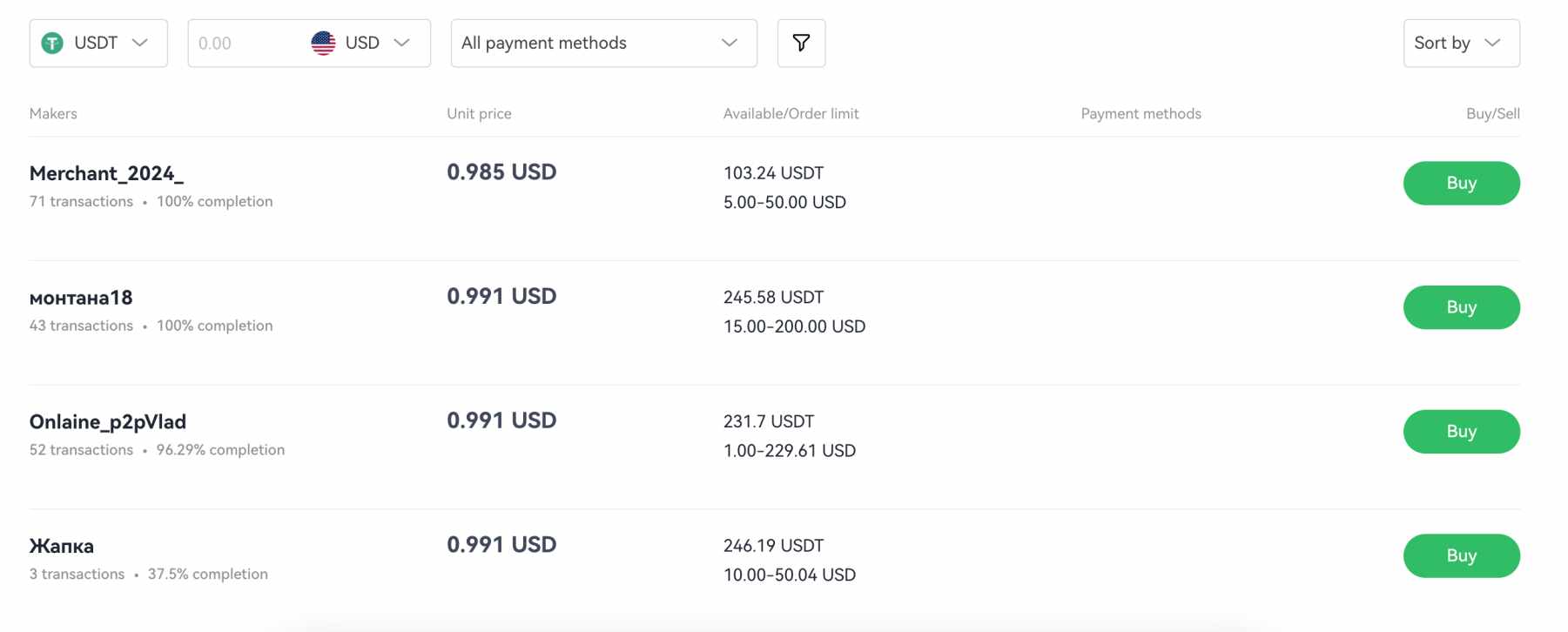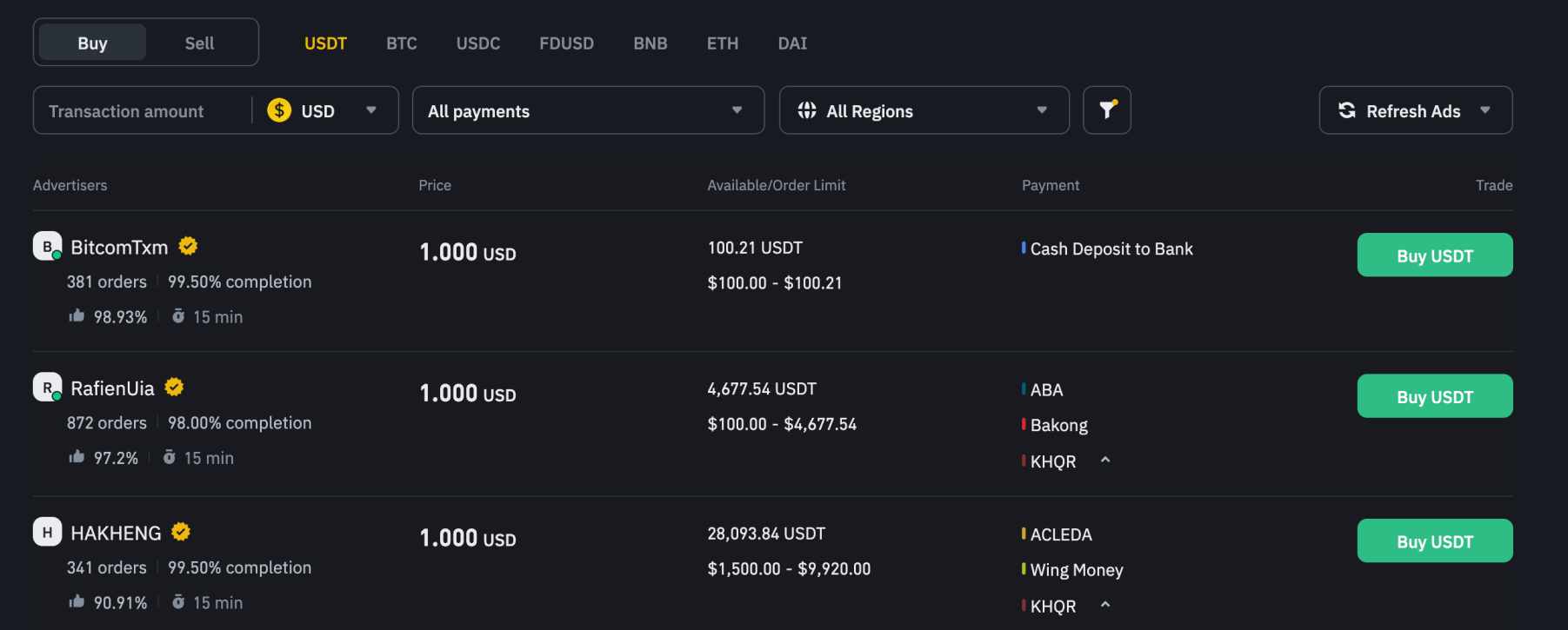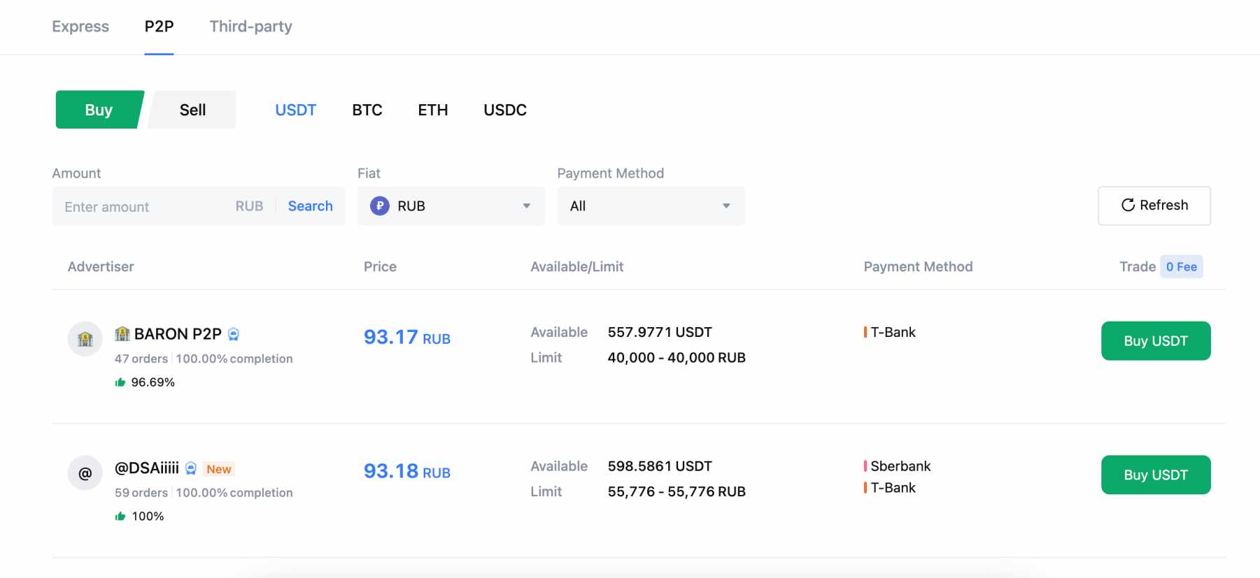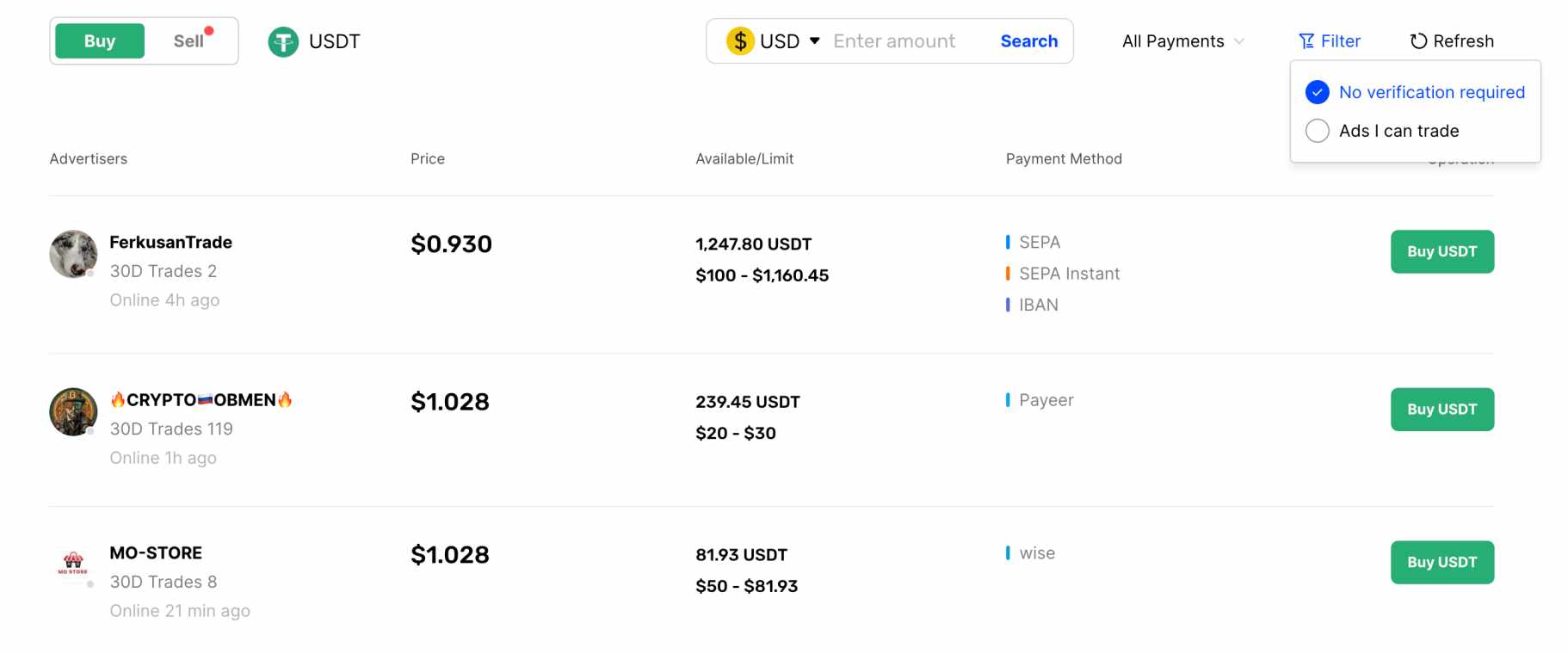 如果您想快速完成交易,后者将非常重要。点击P2P卖家会显示更多信息,让买家做出明智的决定。所有P2P交易均透过Bin托管,以提高安全性。不收取额外费用。请注意,虽然接受美元,但美国客户不能使用P2P平台。