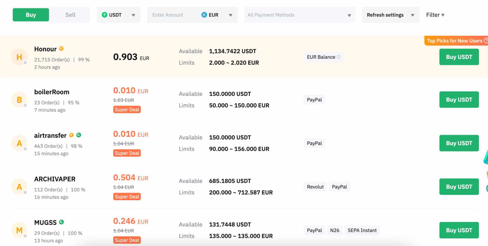 接受 900 多种付款方式,包括本地和地区银行转帐(如 SEPA)、Skrill、Neteller 和MasterCard Send。然后,Binance会显示合适的卖家,从最佳汇率开始排列。卖家还可根据已完成交易的数量和平均付款时间进行筛选。
