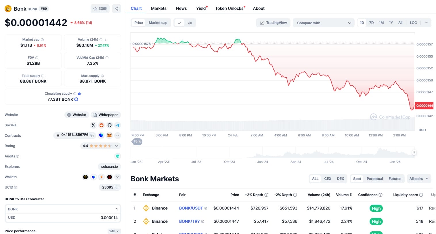 Bonk 最初的代币价格为 $0.000000109,最高涨至 $0.000058。目前,Bonk 交易价格为 $0.000058,总市值达到 11.3 亿美元。