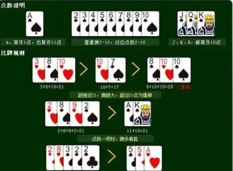 点数计算:每张牌都有点数(牌点数),2到10的牌点数就是其牌面数字(的牌面);J、Q、K(10 J Q K)点数是10分;A牌(a牌)有两种算法,1或者11,如果A算为11时总和大于21,则A算为1。例如(A,8)是19点,(A,7,J)则为18点。点数(點數)是21点游戏中判定胜负的核心元素,所有牌的点数总和超过21点即为爆牌。