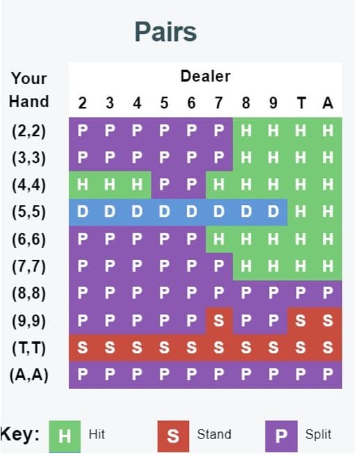 Always Split 8s(除非使用 H17 规则,否则你会放弃 A)。如果玩家的手上 的 牌是两张8点的牌(對 子),建议分牌。这样可以避免16点的尴尬局面,增加获胜机会。分牌后,玩家的每一手都将与莊家 牌 面进行比较,依据各自的點數决定胜负。