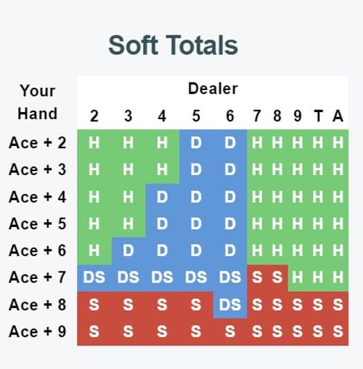 这两项行动将构成的玩家大部分决策。学习在每种情况下何时拿牌或站立是基本策略关键。玩家的选择通常取决于手中 的牌点数、手上 的 牌组合以及莊家牌面。例如,当玩家手中有a牌时,可能形成soft hand,这时的牌点数更灵活。通过记住基本策略,您可以记住使用任何两张给定的牌对付任何莊家最佳、最划算行动。
