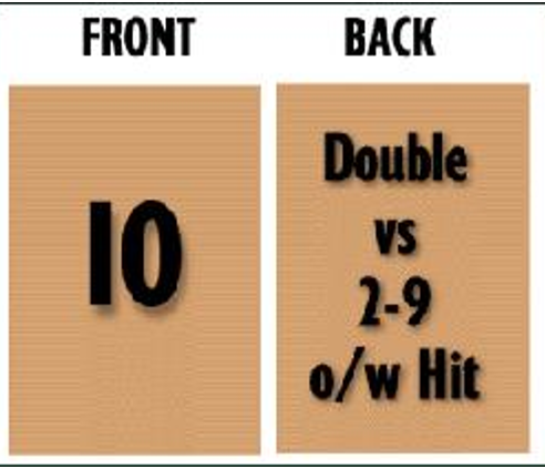 请记住,21点基本策略算牌上面所列基本策略只适用于先前所列赌规(6-decks,DA2,DAS,S17,No Surrender)。你必须根据你所选定赌场规则来产生自己基本策略。当你制做好你基本策略表后,就背好它。为了帮助记忆,我们将做一套卡片,还记得吗?你大概在学加减法时用过它,它们同样能帮你赢21点,你需要为每一手牌做一张卡片,在“2X2”英吋卡片上写上内容完成如下所示。