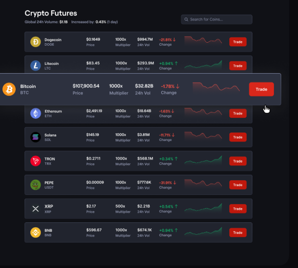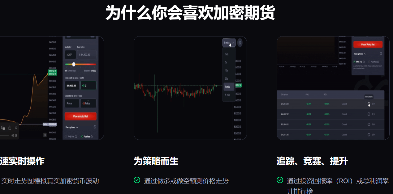 CoinFutures是一个结合模拟交易与游戏设计的加密期货平台,特别适合短线操作型与策略爱好者。无需KYC、即开即玩、可提早平仓与高倍槓杆的特性,让它成为在高度监管环境下的一个「自由场域」。