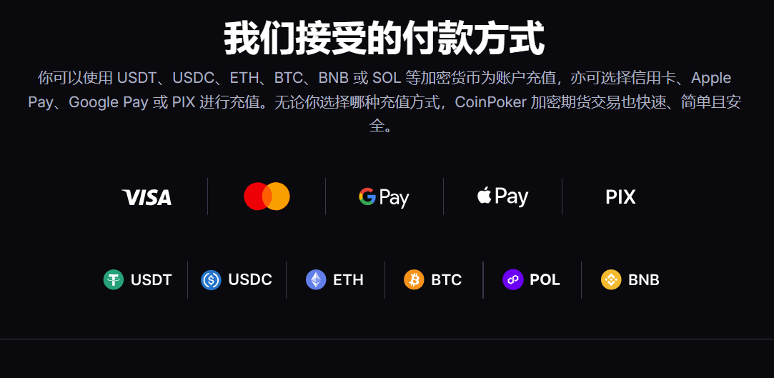 在支付方式方面,CoinFutures提供多样化选项以满足全球用户需求。除了支援使用 USDT、USDC等稳定币入金外,平台亦接受BTC、ETH、BNB与 SOL等加密货币充值,保留高度去中心化的资产接入途径。此,针对不便使用加密钱包的新手,CoinFutures还提供包括信用卡、Apple Pay、Google Pay等主流第三方支付方式,甚至复盖巴西地区常用的PIX本地付款系统,实现真正的全球化参与。