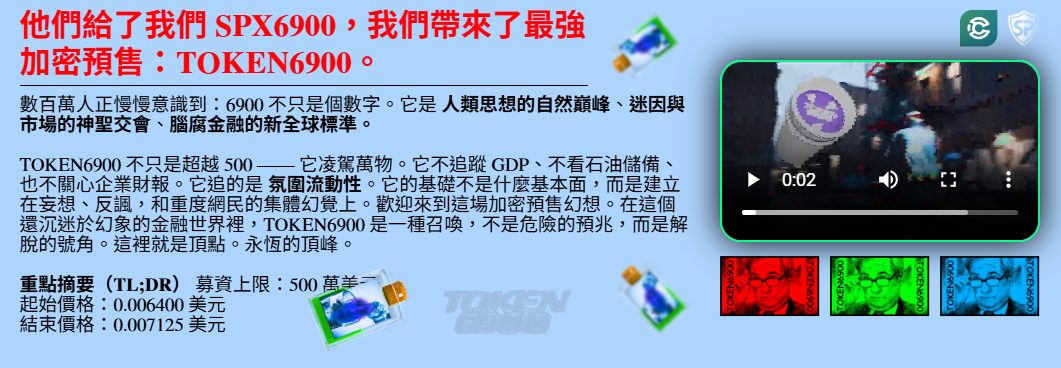TOKEN6900($T6900) 是为永远在线的交易者打造的反S&P500代币:没有指数、没有效用、没有腐败监管者——只有纯粹、极致的迷因疯狂。他们给了我们S&P500和SPX6900,社群则回敬一枚TOKEN6900。其價格完全受市場情緒和集體幻想驱动,缺乏传统投资價值。