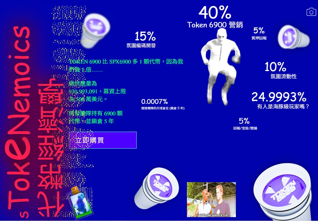 TOKEN6900 是对 S&P 500 的彻底解构重生:没有指数、没有效用、没有贪腐机构,只有赤裸裸的迷因狂热和荒谬的包裝。正如SPX6900曾给市场带来冲击一样,TOKEN6900则带来了更极致的精神崩坏版本,其包裝和設計本身就是对传统金融和市场的批判。