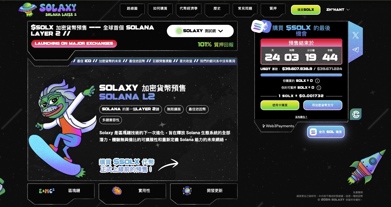 - 最后一阶段则是发布 Solaxy 的 Layer-2 主網,实现高吞吐量的去中心化应用(dApps)与扩容特性,并计划集成 layer 2 解決方案 和跨鏈橋等关键基础设施。
