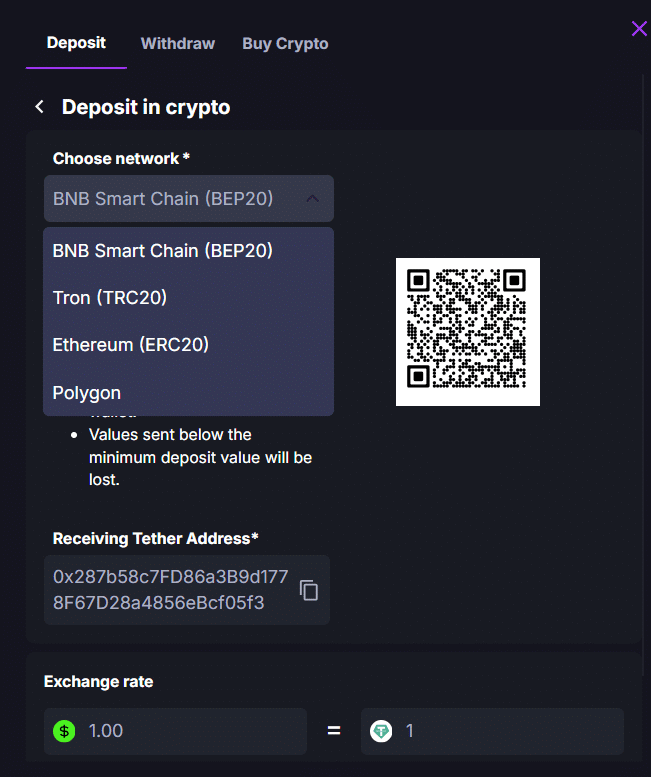 点击“钱包”以打开存款选项卡,并将加密货币切换为“Tether”。复制CoinCasino提供的唯一赌场钱包地址,然后登录您的个人加密钱包,将所需数量的USDT发送到该地址。在确认交易前请再次仔细核对所有信息以避免错误。