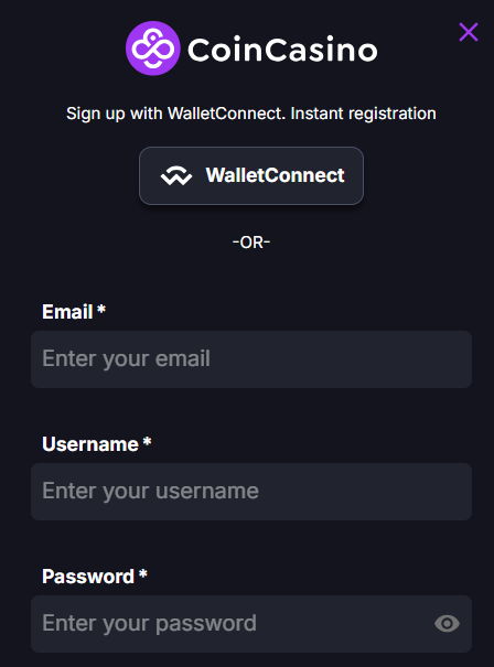 访问CoinCasino网站并点击“注册”。然后输入你的电子邮箱地址、用户名和密码。只要使用我们的注册链接即可领取欢迎奖金,无需输入促销码。