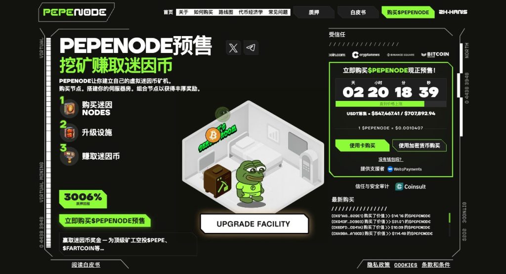在主流以太坊储备公司吸引机构资金同时,新型Web3专案也在试图打破传统模式,创造更易于参与与理解的链上互动模型。Pepenode($PEPENODE)正是在这样的思维下诞生,将复杂的挖矿与代币产出机制转化为轻度策略与游戏化操作。玩家可在虚拟矿场中部署装备、升级产能,并透过互动式介面产出具迷因属性的资产,在游戏中自然学习区块链运作方式。