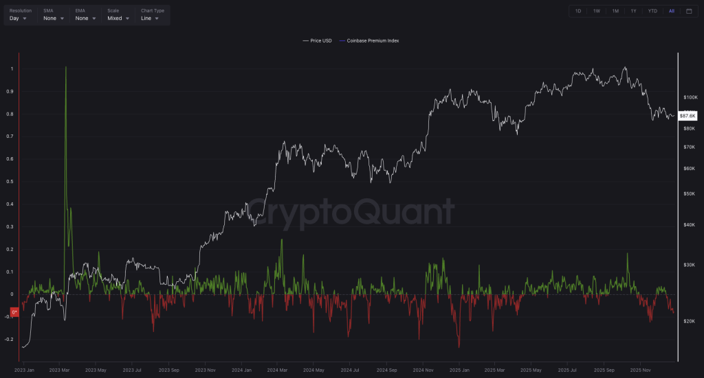 随着2025年步入尾声,比特币市场正处于一个微妙的转折点。一方面,美国最大的合规交易所Coinbase出现了罕见的长期负溢价现象,这不仅反映出美国交易者的抛售价低于全球均价,更揭示了市场底层结构的变动。