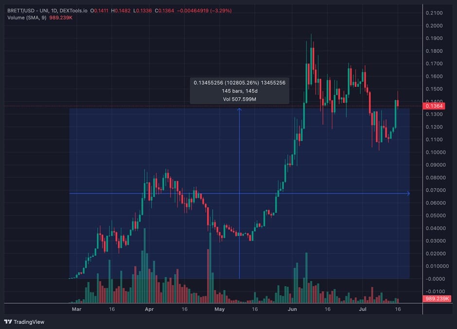 自从 $BRETT 代币在今年 2 月推出以来,其价格已经暴涨了 1,000 倍,最高市值达到了 14.8 亿美元。