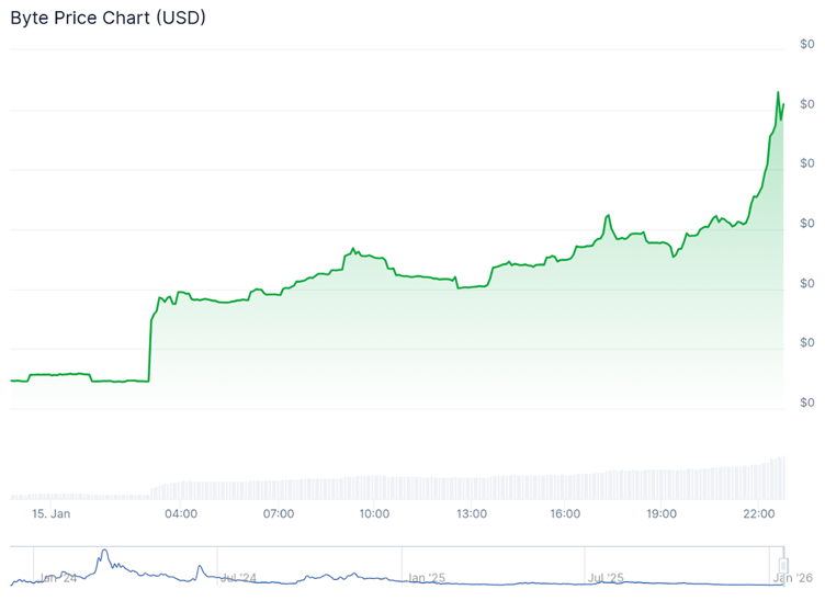 然而,进入 2026 年初,风向彻底改变,行业重拾牛市动能。这种乐观情绪直观地反映在 BYTE 的走势上——它在一夜之间飙升了 315%,创下了久违的惊人涨幅。