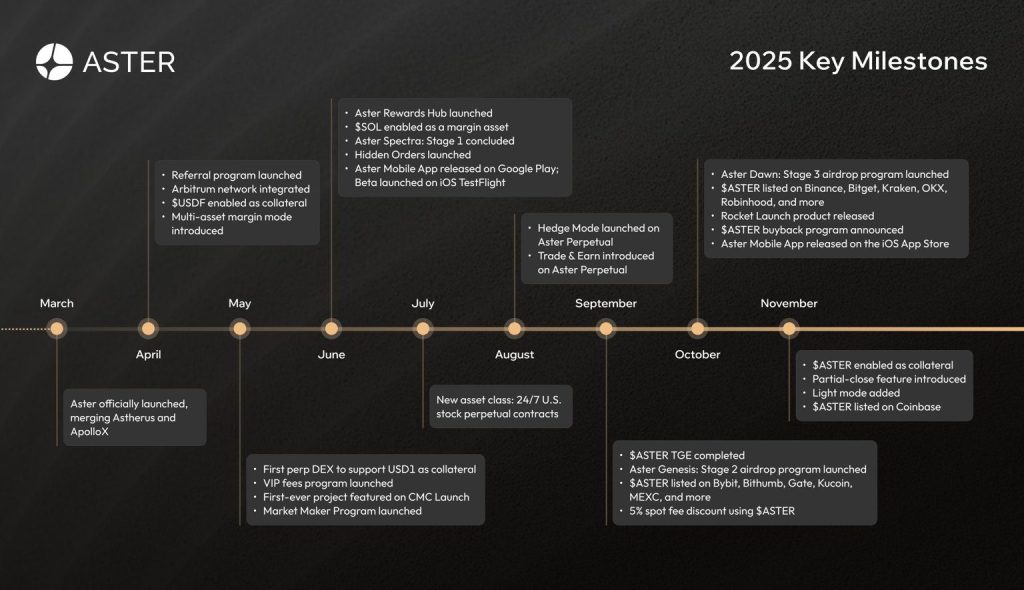 Aster 方面提到,其已在 2025 年完成 Astherus 与 ApolloX 的合并及 代币生成事件(TGE),并发布移动端应用、实现多家中心化交易所上市,整体基础建设已成形。
