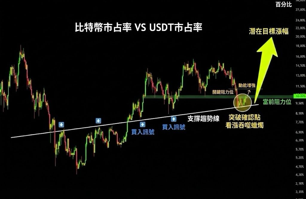 图表中右侧垂直轴显示的百分比刻度,从 3.25% 至 30.00% 的区间,提示了这一波动可能带来的剧烈市占率变化。若预测成真,巨大的黄色箭头所指引的方向不仅是技术指标的修復,更是整个市场风险偏好(Risk-on)重启的先行指标,这对于山寨币市场往往会形成一种吸血效应,即比特币独强而其他资产相对疲软。