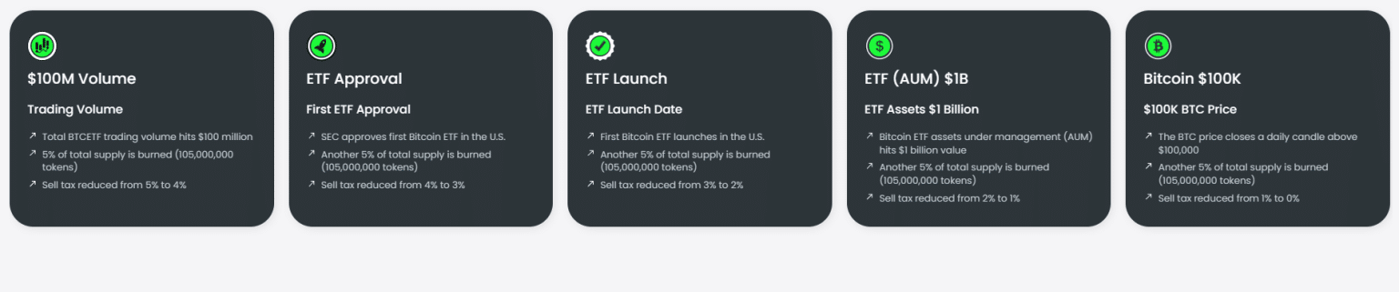 - 10亿美元的ETF资产:该项目计划达到10亿美元的资产管理规模(AUM)。这一级别的采用表明对加密ETF有很强的信任,可能会吸引更多用户。随后的代币销毁和将交易税降至1%可能会增加对$BTCETF的信任和需求,有可能导致价格上涨。
