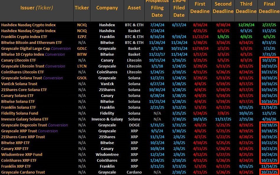 另一方面,市场对加密货币的需求,也可能受到对即将到来的山寨币季节的期待所驱动,因为几个与山寨币相关的现货交易所交易基金ETF的申请,很可能在政府重新开放后获得批准。Canary Capital的莱特币ETF即将迎来回覆,其他则面临10月10日至24日的截止日期。然而,美国证券交易委员会SEC在10月1日确认,它在关闭期间不会审核任何申请。