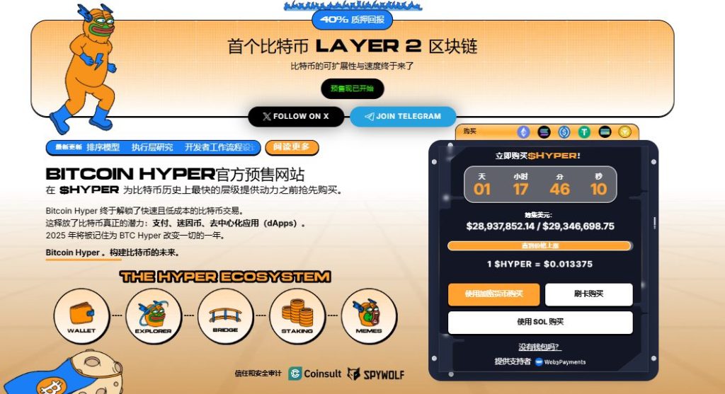 比特币重返牛市领域,为比特币相关预售项目如BTC Hyper(HYPER)创造了正面动能。该项目是基于Solana的SVM构建的比特币Layer 2解决方案,透过Canonical Bridge使用包裹式BTC,实现快速、可扩展的DeFi、NFT及应用程式。