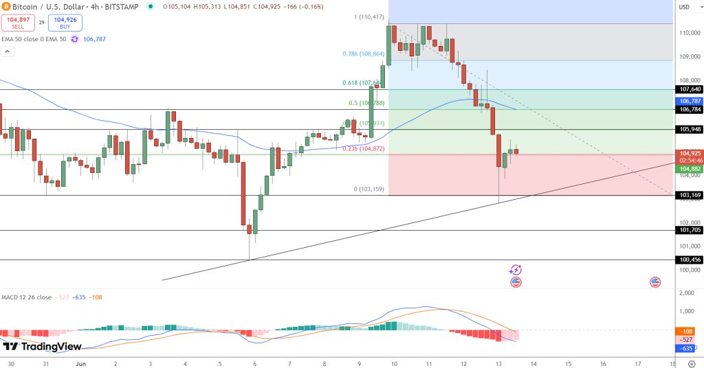 目前价格勉强守在23.6%回撤位(104,872美元)上方,短线仍面临进一步下探风险。