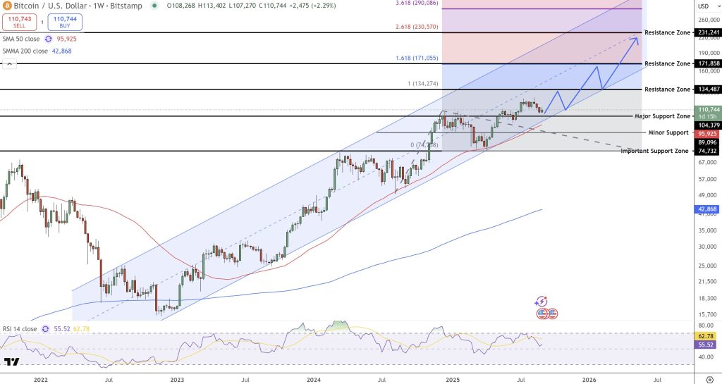 下一个关键阻力位在134,500美元 附近,而斐波那契延展水平显示,如果动能加速,潜在上行目标可能扩展至171,000美元,甚至231,000美元。在下方,95,000–100,000美元区间构成强力支撑,预计将吸引买盘,从而维持整体的上升趋势结构。