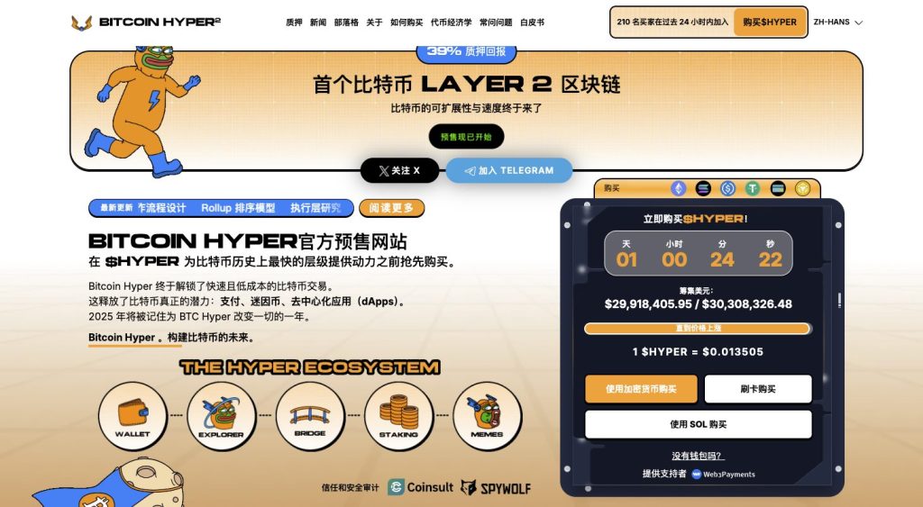 在比特币走向稳健化的同时,增量资金开始更积极地寻找「比特币生态内的高增长选项」。Bitcoin Hyper($HYPER) 的预售进度提供了一个清晰样本,募资规模达3,000万美元,代币价格进入0.013505美元的新阶段,倒数约剩1天6小时;过去24小时新增买盘超过50万美元,且新增406位买家。更具象徵性的是单一大型投资者买入约31万美元HYPER,刷新预售期间最大单笔个人买入纪录,直接推升市场热度与关注度。