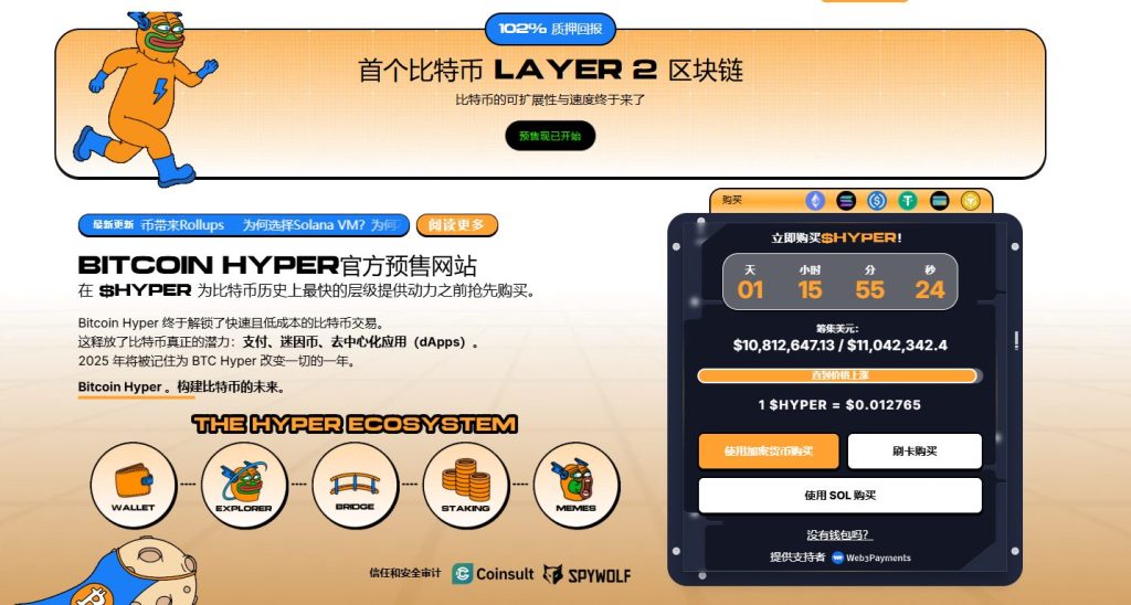 该项目已通过Consult 审计,并以可扩展性、简洁性与信任度为核心进行构建。随着热度飙升,投资者兴趣持续升温,预售已突破$10.6M,目前仅剩下少量份额可供认购。HYPER代币现价仅为$0.012755,但价格即将上调。你可以通过加密支付或银行卡,直接在Bitcoin Hyper官方网站购买HYPER代币。