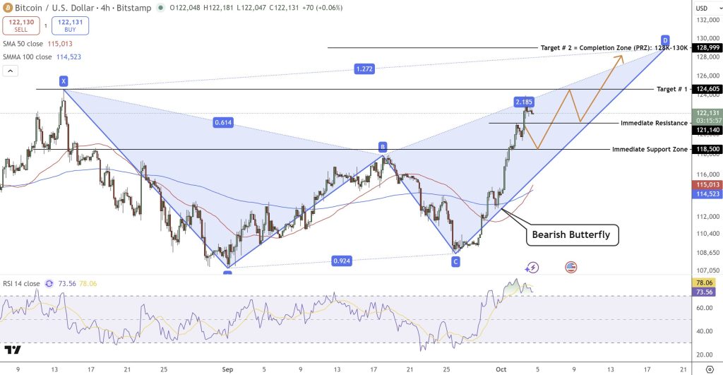 不过,图表同时显示出一个看跌蝴蝶谐波形态(Bearish Butterfly),这一技术形态通常意味着上涨趋势可能接近尾声。