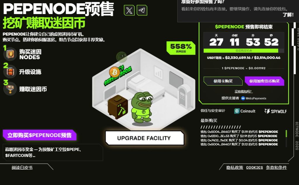 Pepenode是一个新兴加密项目,即便市场环境艰困,已成功募资超过230万美元。这是一个游戏,让玩家无需昂贵的电脑设备即可「挖矿」获取代币。玩家可在网页浏览器中游玩游戏,设定虚拟挖矿节点,并升级设施以赚取更多代币。