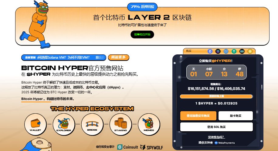 Bitcoin Hyper ($HYPER)将自身定位为首个原生比特币Layer 2解决方案,由Solana虚拟机(SVM)驱动。其目标是透过实现闪电般快速、低成本的智慧合约、去中心化应用程式(dApp),甚至迷因币创作,来扩展比特币生态系统。