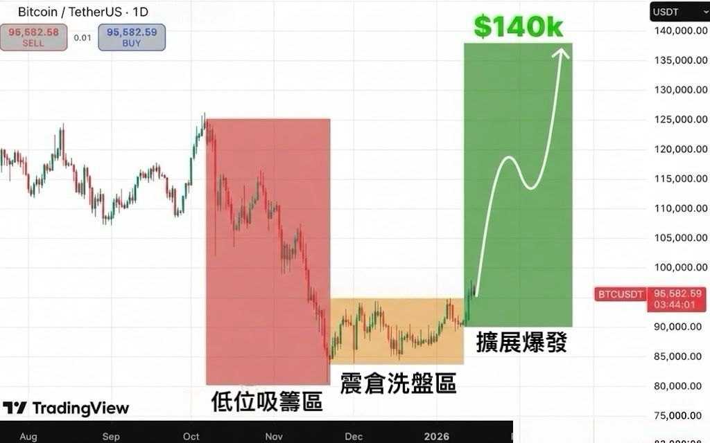 当前的结构完全符合威科夫理论(Wyckoff Theory)中的吸筹后突破模型。随着比特币目前站稳95582美元上方,市场已经发出了明确的看涨讯号,14万美元的目标不仅是技术上的阻力位预期,更是这一轮週期扩展的关键节点。