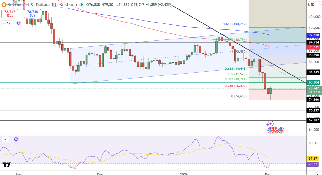 如果比特币在 74,700 美元附近获得支撑并出现反弹,可考虑建立多头仓位,目标看向 80,700 美元。止损可设在 72,000 美元下方,以防范美联储政策变化引发的进一步流动性冲击。