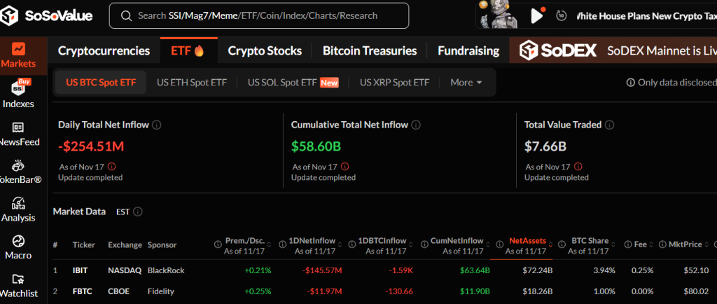 不过,支撑着加密货币今轮升势的基本因素─ETF,在市场下滑的情况下,资金持续出现流出势态,根据SoSoValue的数据显示,现货比特币ETF于周一出现2.545亿美元净流出,其中BlackRock旗下的IBIT录得净流出1.455亿美元,是资金净流出最大的一只比特币ETF。